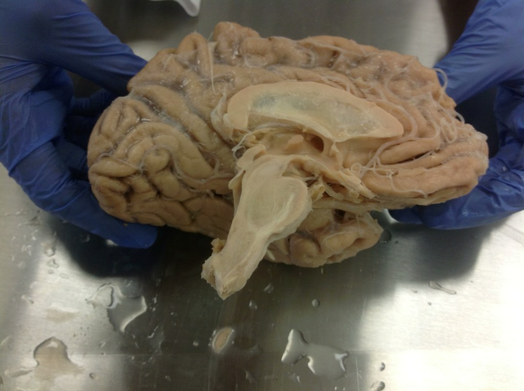 For now, let’s move upstream from the firing of neurons to larger clusters of neurons working together. When you dissect the brain, you can us a long dull knife to cut down the longitudinal fissure and down through the corpus collosum connecting the hemispheres, and down through the brainstem and end up with two nearly identical halves. If you look on the inside of each of those halves, you will see some parts that are darker than other parts. The dark parts are layers of neuron cell bodies. The lighter parts are axons, which are coated in fat making them look paler. You can see the tracts of axons going up and down the brainstem. They look like white threads.