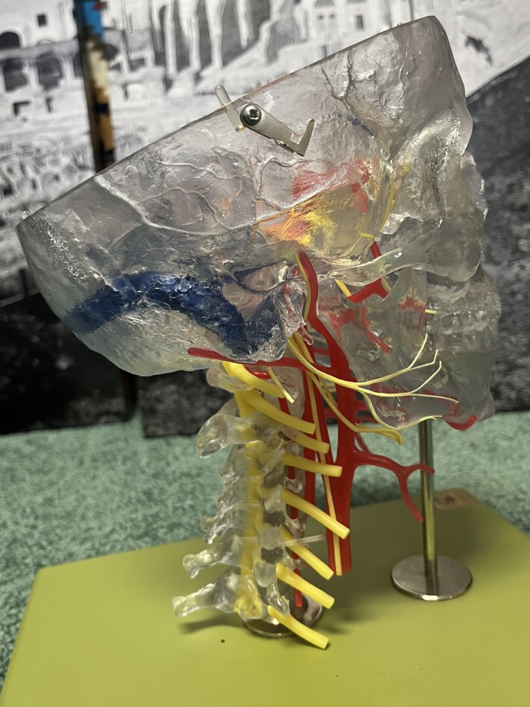 Here is side view of Skully. You can see the vertebral processes sticking back from the cervical vertebral column. The largest on the bottom is the vertebral prominens of C7 and can easily be felt on the back of your neck. Count up from there to C2, Axis, and C1 stuck to the bottom of the skull, Atlas. You can see the spinal cord, in yellow, inside the vertebral column, and the large spinal nerves coming out. In front of all that is the larger right carotid artery, or the common carotid artery. It splits into the external carotid artery moving forward, supplying the thyroid, face, and mouth, and the internal carotid artery climbing up into the skull to join the Circle of Willis.