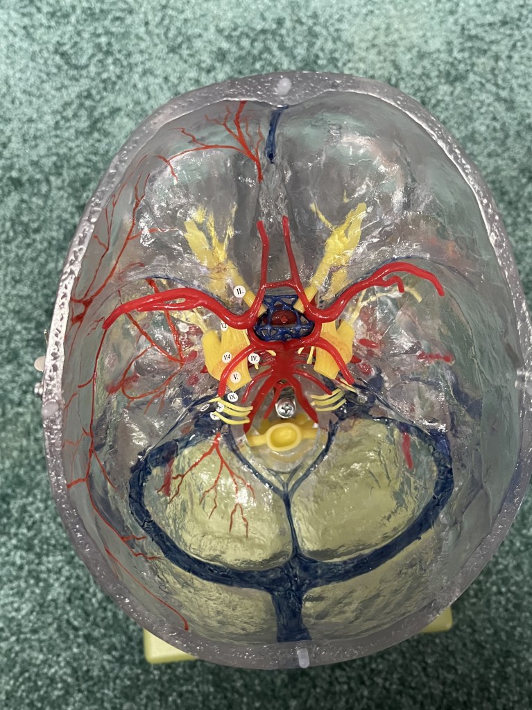 Looking down into the skull with the brain removed you can see the arterial supply and most of the venous draining from the brain. In the bottom of the image, you can see the confluence of sinuses. This is the junction of the superior sagittal sinus coming from the top of the brain, the straight sinus draining the middle of the brain, and the occipital sinuses. Venous blood will drain left or right along the transverse sinuses, down the sigmoid sinuses and into the internal jugular veins.