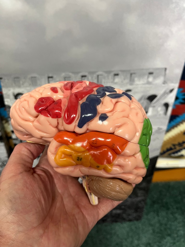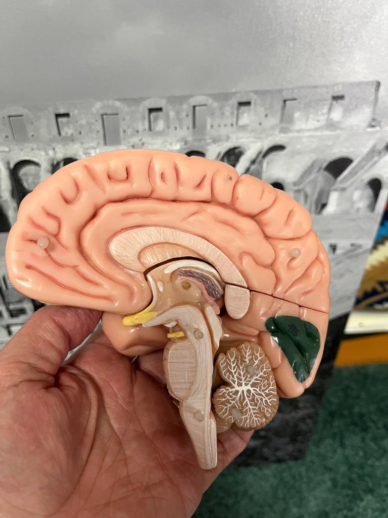 Here, the model is taken apart into left and right sides. This is the inside of the right half. This view is called mid sagittal in imaging and dissection. You can see the medulla at the bottom of the brain stem, and the bulge above it is the pons, and the midbrain sits on top of the pons. The cerebellum, which ensures coordination, is hanging off the back. Those white spidery lines are bundles of axons, white matter. The third ventricle and the thalamus are right in the center, capped by the corpus collosum, which is a huge (colossal) band of axons going back and forth between the hemispheres. The cingulate gyrus sits above the corpus callosum and produces emotional reactions, decision making, and memory.